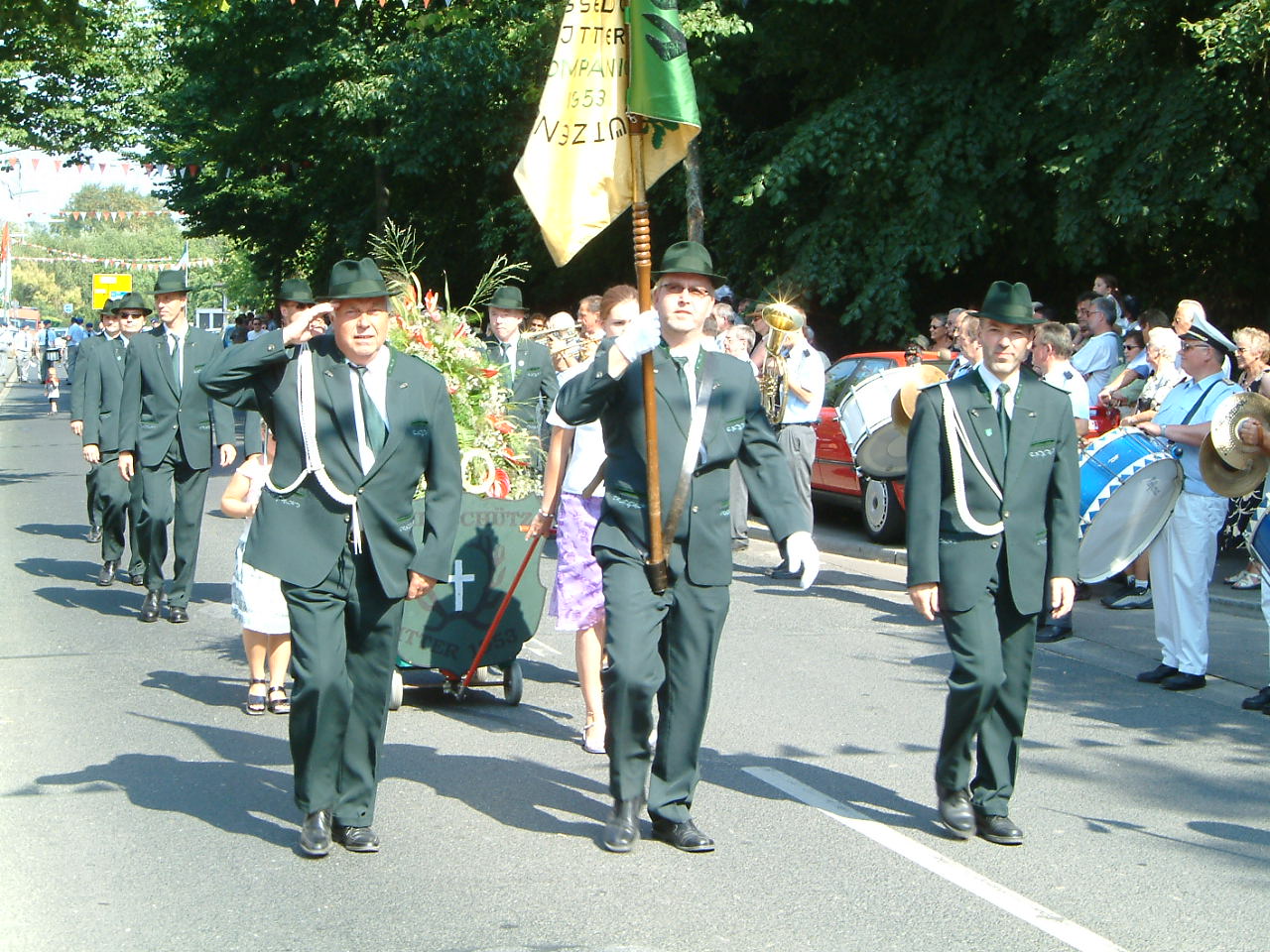 Den Sonntag begannen die Itterer Schützen ganz gemütlich mit einem Fühschoppen, ehe am Nachmittag der Festzug durch den Stadtteil und die Parade auf der Itterstraße auf dem Programm standen. Angesichts der b rütenden Hitze und knallender Sonne hatten die Schützen vorgesorgt: während der Pause vor der Parade gab es jede Menge Getränke, die Fahnenschwenker hatten sogar an warme Würstchen mit Senf und Brot gedacht. Und für die Majestäten und zahlreiche Ehrengäste - unter ihnen der Landtagsabgeordnete Hans-Peter Milles, Ratsherr Wolfgang Janetzki und Bezirksvorsteher Heinz - Leo Schuth - hatten die Schützen große, Schatten spendende Sonnenschirme am Paradeplatz aufgestellt.